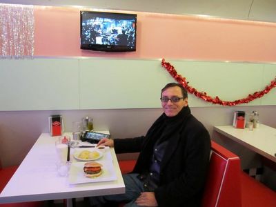 Having a burger at an American themed restaurant. The owner was really interested in my opinion of his food and was it like American burgers and fries. Close enough.